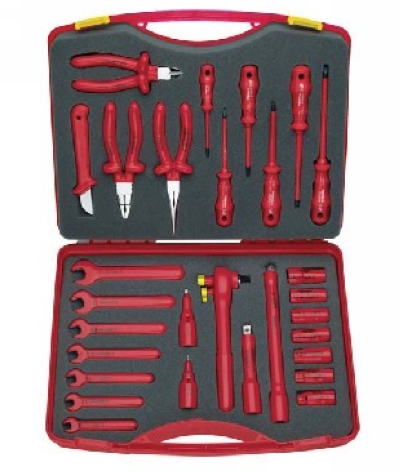 可以在1000V以下电压安全带电作业,电工专用; ...410:电工虎钳(190mm)1把,电工弯嘴尖嘴钳(200mm)1把, 电工剥缆刀1把, 电工偏口钳(160mm)1把,电缆剪钳(0.5- 16mm2)1把,水泵钳(240mm)1把,电工绝缘电缆刀1把, 电工双色一字改锥(3.5x100,5.5x125,6.5x150,8x175mm)5把, 电工双色十字改锥(PH1,PH2)2把,电工开口扳子(10,13, 17,19mm)4把,1/2″电工棘轮扳子1把,1/2″电工接长杆 (125mm)1根,1