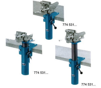 配合固定式台虎钳使用(本装置未配台虎钳)。 可以十分轻松地在0-200mm高度自动升降, 根据使用者身高不同立刻调整到合适高度。 还可以根据工件所处角度在0-360°范围内调节台虎钳。 松开安全手柄,打开锁紧装置,气压弹簧向上产生极大弹力, 推动台虎钳向上,上弹力超过重力,调节高度时感觉不到台虎钳重量。 调节后锁紧手柄。