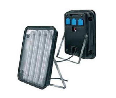 用于维修汽车和机器设备移动照明,亮度超过500W的卤素灯。4个36W灯管,照明亮度显著增大,外形美观,防眩目光线。IP54级防水溅,可防雨雪,户内外适用。照明灯管与一般钨丝灯泡相比,寿命更长。230V,电源线5m长。带3个防水插座,有自动闭合的防水护支架,
