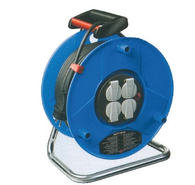 标准电缆绕线器,用于接长电源送电半径。4个安全插座,带防尘保护盖。殊耐撞塑料卷盘,锁紧制动功能,电缆固定扣。钢架结实耐用,方便携带。