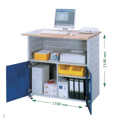 尺寸: 宽 1100×深 800×高 1100 mm。 实心操作面 宽 1100×深 800×高 25 mm 带漆表面, 圆形边角。 稳定和扭转自由钢板结构。 开放式货架, 高 370 mm ,柜体后部可接电源线及有线电视线。 底柜为双叶门(可上锁) 分为两个储物空间 (170 和 330 mm)。 可选固定式(通过底座可水平调整) 或者移动式(有2个固定脚轮和2个旋转脚轮)。 柜体: RAL 7035 浅灰, 门: RAL 5010龙胆蓝。 柜体:RAL 7016 煤灰色, 前面板 RAL 5012 浅