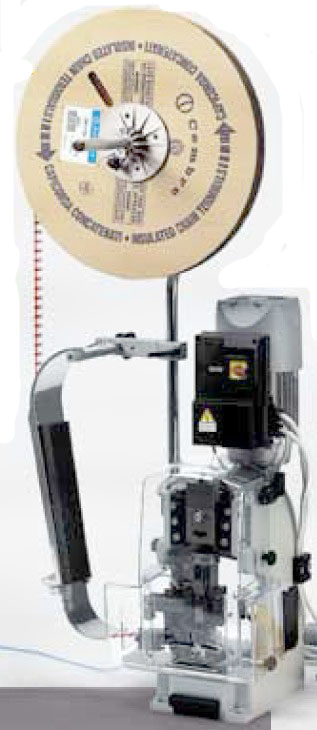 Elektromechanische Tischpresse mit Fusspedalschalter. Es werden spezifische Crimpeins?tze verwendet, die eine sichere und schnelle Verpressung der gesamten Palette von PC-isolierten Kabelschuhen und Aderendhülsen auf Band erm?glicht. Die Lieferung erfolgt ohne Crimpeinsatz.