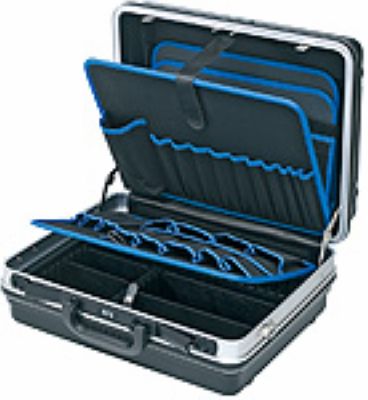 耐磨ABS材料,强力型,黑色;用铝框架加固,带D形环,用于加肩带;3位密码锁,两个夹锁可固定箱盖;金属铰链;盖固定器带铰链连接机制;箱盖内有文件箱;盖内有可拆除工具板,带9个插入式工具袋,两侧有弹力松紧带;底端带有10个小型和1个大型的插入式工具袋;底层高55mm,可分隔摆放工具,盖板带插袋通过锁扣固定;外部尺寸(WxHxD):465x200x410mm;内部尺寸(WxHxD):440x180x350mm