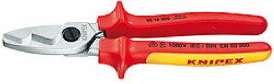 用以剪切铜铝电缆,单股线和多股线;不可用于剪切钢丝和铜质硬拉线;由于采用了适当的高杠杆传输力矩比和新刀片的几何设计,剪切时只需用很小的手力;(上下刀片)初始和最终剪切直径最高达20mm;长度200,头部镀铬,双色双重材料绝缘手柄