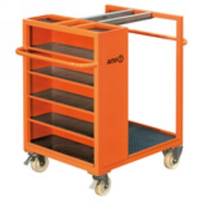 without clamping equipment and without holders. Rugged steel housing, storage compartments designed with rubber mats. 2 rollers + 2 castors with locking brake.