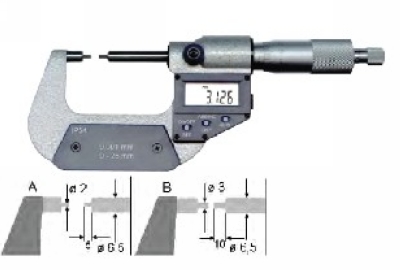 圆柱形测头,用于测量轴类零件花键和键槽直径 液晶显示,读数清晰,公英制示值转换 硬质金属测砧耐磨经用,独特按键 任意点置零,开关功能,显示时间 夹紧杆能快速、准确定位 棘轮测力,电池SR44 大于25mm的外径千分尺配有校对量杆